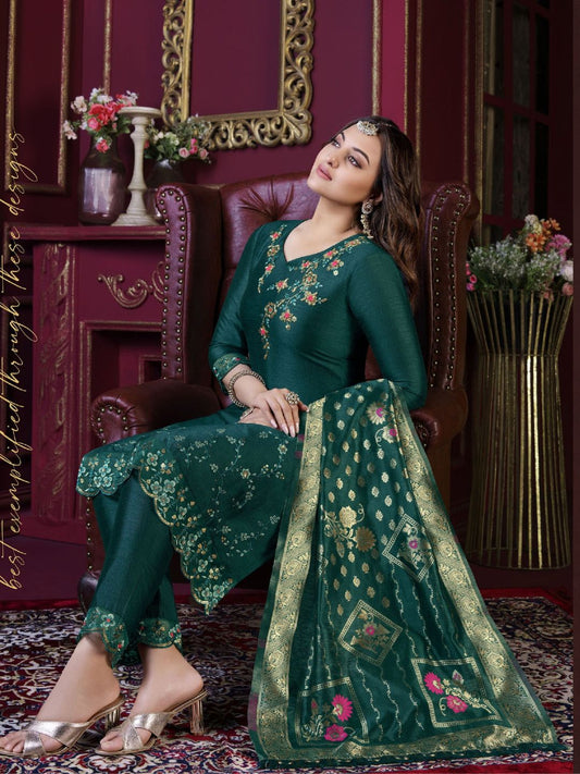 Sonakshi Sinha Bollywood Embroidered Silk Pakistani Style Salwar Kameez in Green Color-71034
