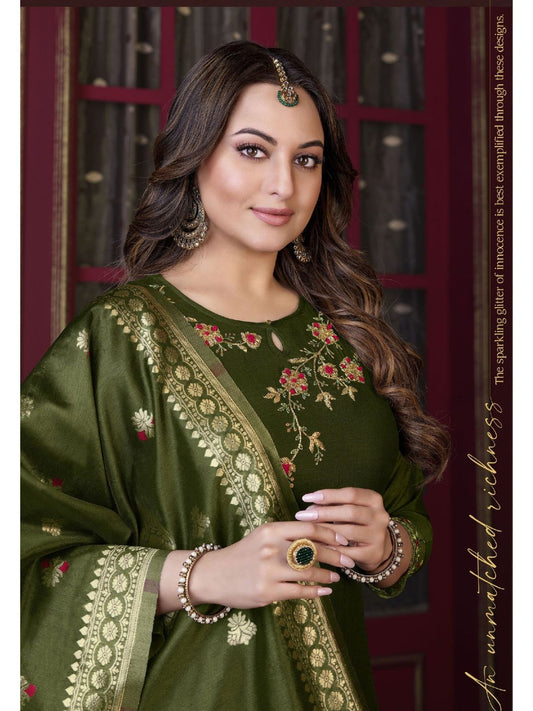 Sonakshi Sinha Bollywood Embroidered Silk Pakistani Style Salwar Kameez in Mehndi Color-71035