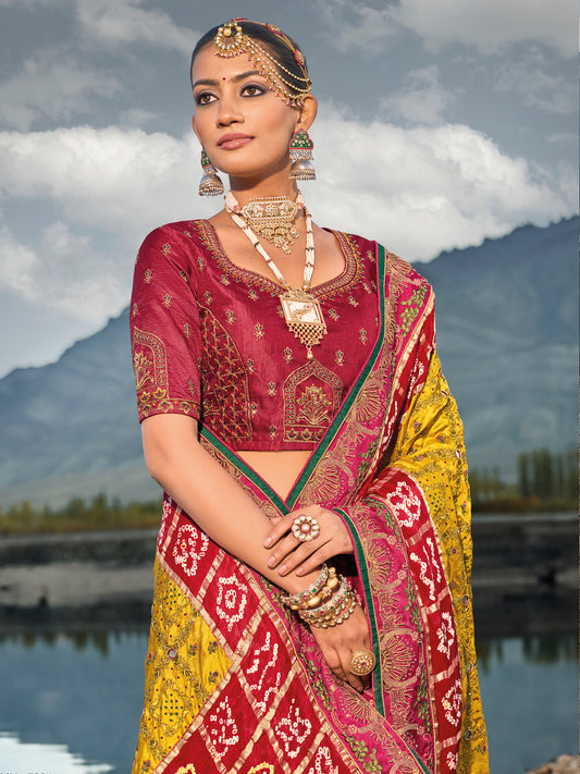 Original Mirror Pure Gjji Bandhej Printed Wedding Bridal Saree In Yellow Color-81664