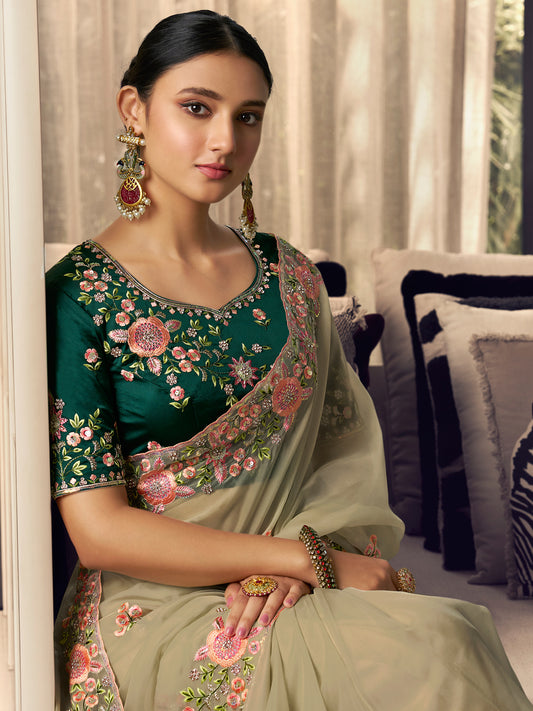 Embroidered Organza Bridal Traditional Saree In Green Color-81708