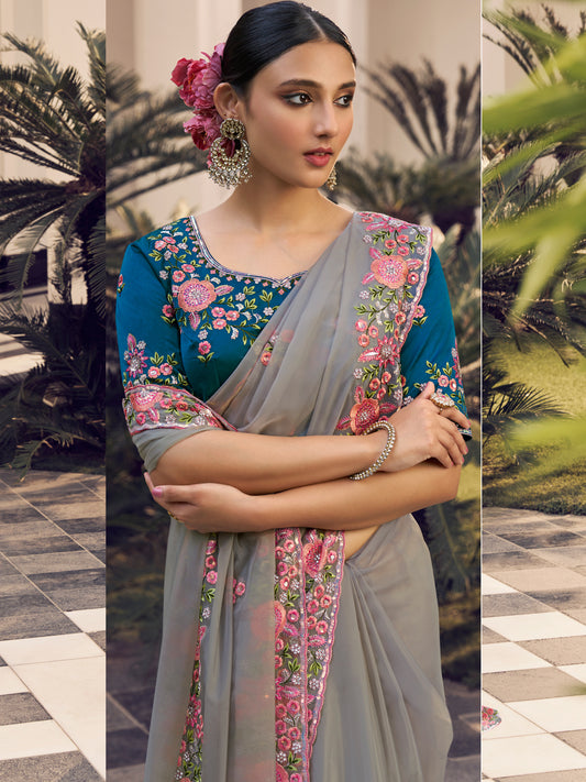 Embroidered Georgette Bridal Traditional Saree In Grey Color-81716
