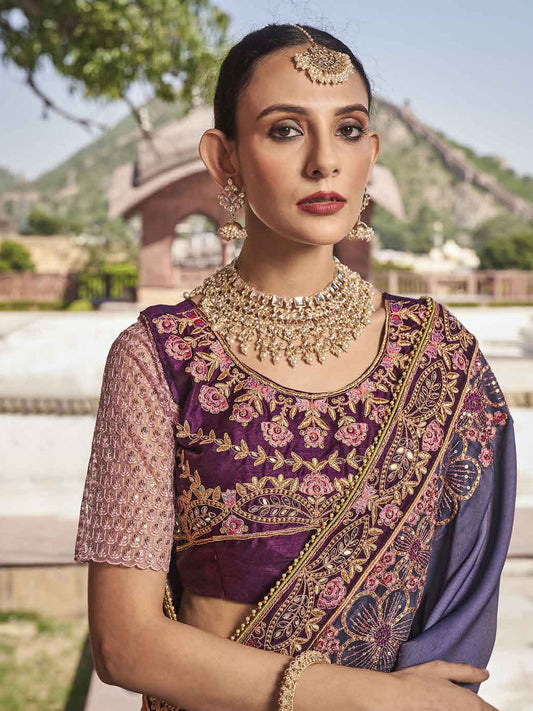 Embroidered Organza Bridal Traditional Saree In Purple Color-81710