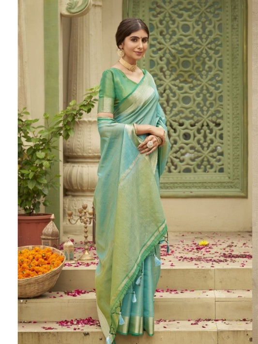 Weaving Linen Handloom Fastive Saree In Light Blue
