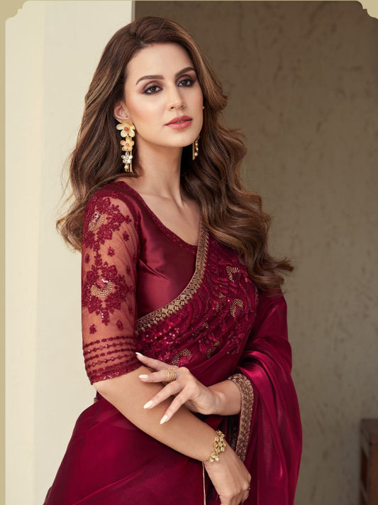 Embroidered Shimmer Silk Wedding Saree In Maroon