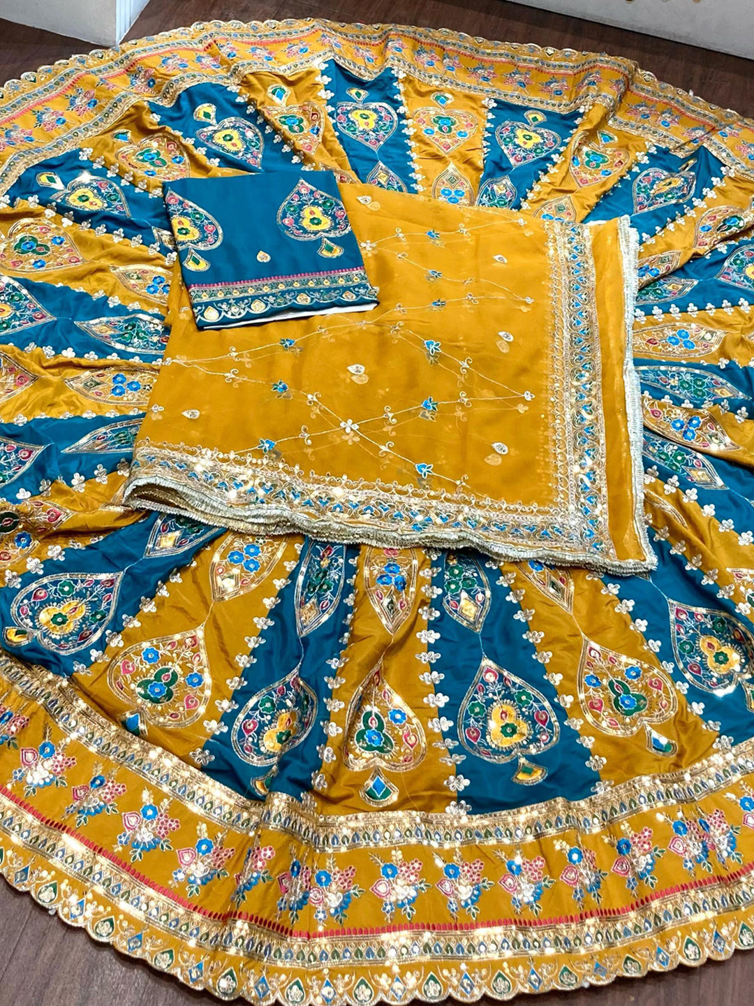 7 Miter full Gher Silk Crepe Premium quality Bridal Rajputi Poshak In Yellow color-91574