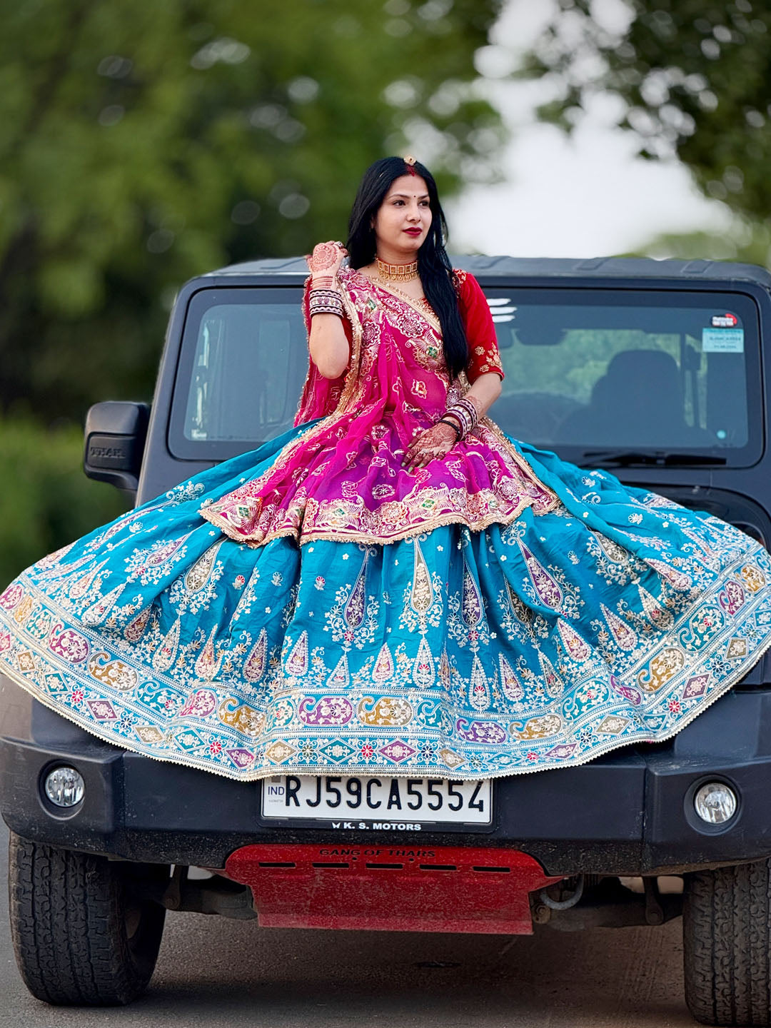Designer Gorgette 7 meter full Gher Premium quality Stitched Rajasthani Lehenga Choli in Pink and Blue color-91346