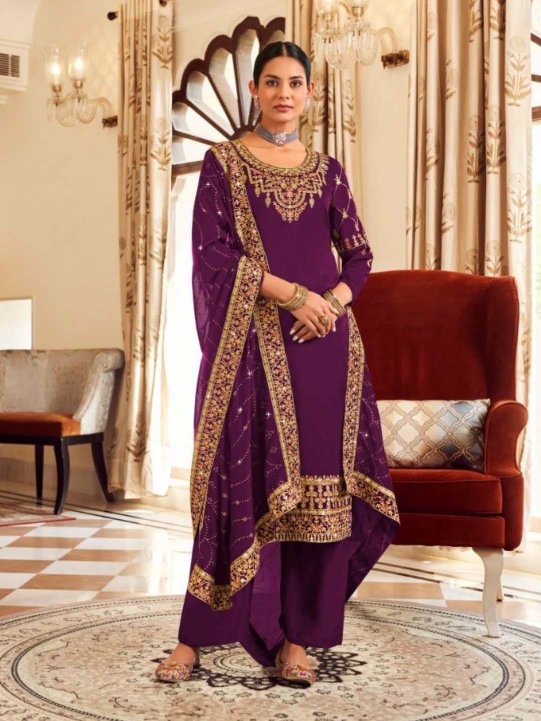 Embroidered Vichitra Festive Straight Salwar Kameez in Puple