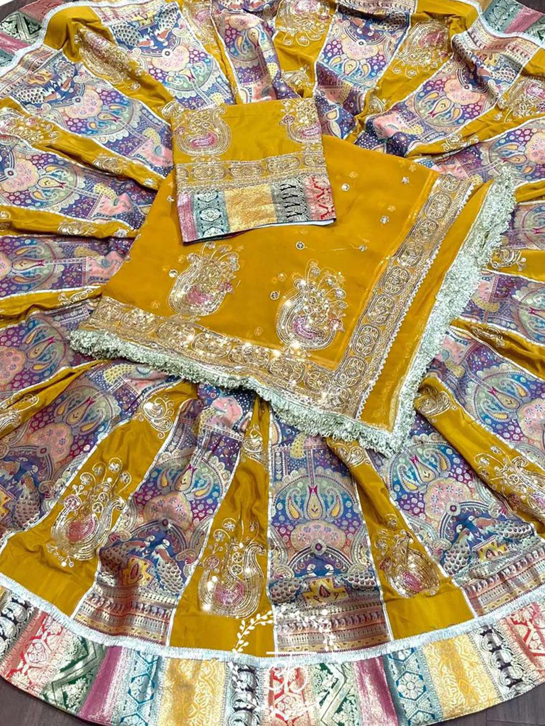Georgette 6 Meter Flare Premium quality Bridal Rajputi Poshak In Yellow color-91613