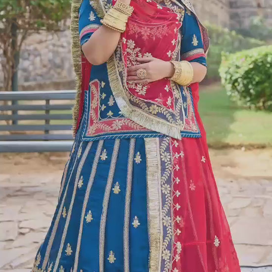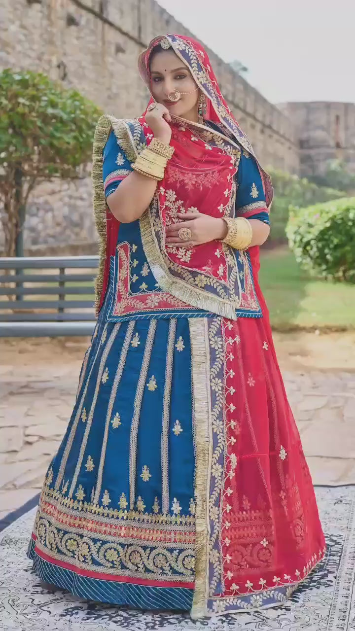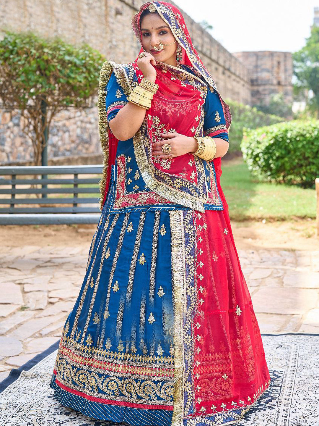 Makhmali Satin 24 Kali festive Wedding Rajputi Poshak In Red and Blue color-91510